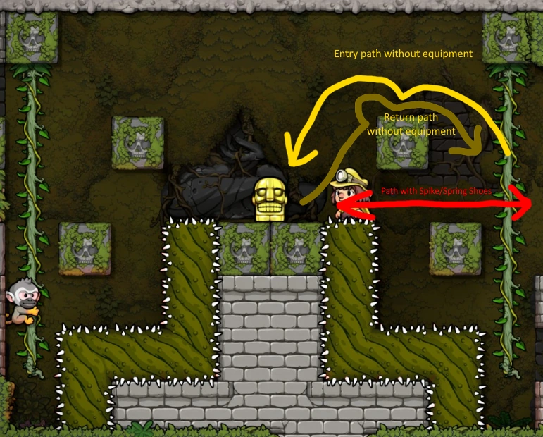 Although confusing and intimidating to collect at first, Jungle Idol traps have a specific path to take to collect the Idol. With either Spring Shoes or Spike Shoes, the player can take a much simpler path, as either shoes allow the player to stand on Thorny Vines. The recommended paths are elaborated in the above image.