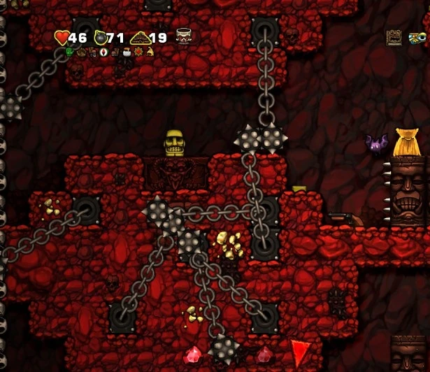 Golden Idols found in Hell are generally guarded by a huge number of Spike Ball traps. To retrieve it, you must carefully dodge the spike balls, while attempting to pick it up.