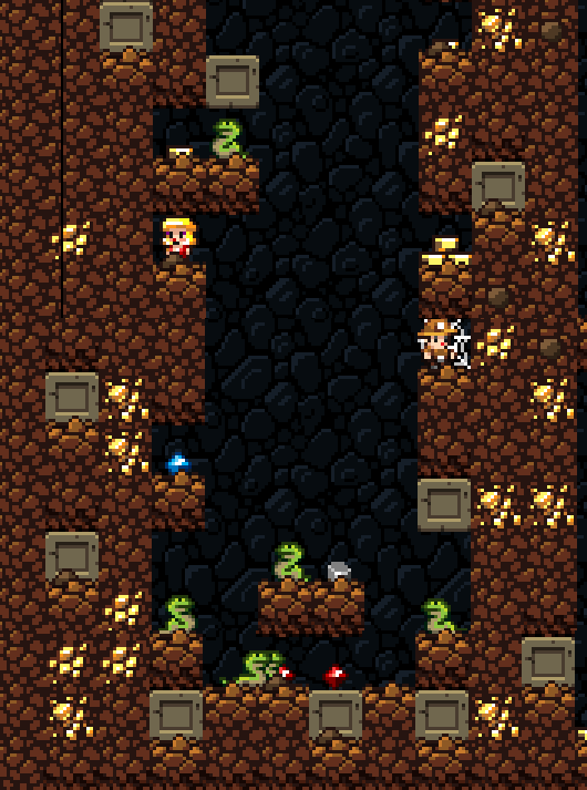 Terrain Features: The level contains a snake pit, a long vertical shaft (with cubbyholes along the sides) filled with Snake. The large amount of treasure that spawns here generally makes a snake pit worthwhile to explore, provided you have enough rope or bombs to facilitate escape afterwards - two or three ropes is usually a safe amount. A snake pit always has two rubies in the bottom of the pit guarded by five snakes. Falling from the top of the snake pit is usually fatal as the snakes will attack you while you're stunned.