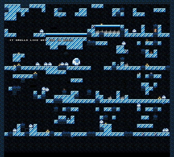 Terrain Features: Unlike ordinary levels in the Ice Caves, the terrain of the Yeti Kingdom is much more continuous (although a large portion of it is ice), so the risk of falling to your death is not as great. However, fragile ice bridges with spikes underneath are common, and the loose blocks dropped by the Yeti King can block passages or crush you unexpectedly. The level usually generates similar as the Caves, but with the addition of different traps.