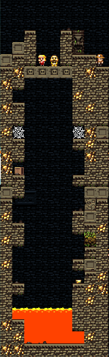 Terrain Features: A deep pit spawns with numerous Arrow Traps and a pool of lava at the bottom. A Damsel and a Golden Idol can be found suspended above on a platform. Picking up the Idol causes the platform to disintegrate instantly, sending the Spelunker into the pit. This usually results in death, unless he has climbing gloves or a Jetpack to aid his escape.