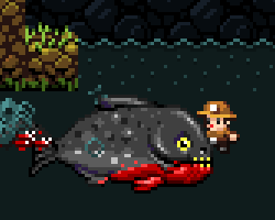 Simply reaching Megamouth is an ordeal in itself - the water it resides in is filled with swarms of the smaller Piranha, which might kill you long before Megamouth decides to chase you. The boss does drop four supply crates, which tend to carry ropes and bombs, but you may always get lucky and find something very useful.