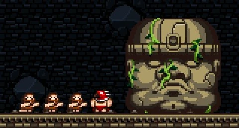 The Hawkman is knocked unconscious as the Cavemen attempt to flee, the slowest of which is crushed beneath Olmec as it smashes down. The Giant figure then rises into the air again and approaches the Spelunker.