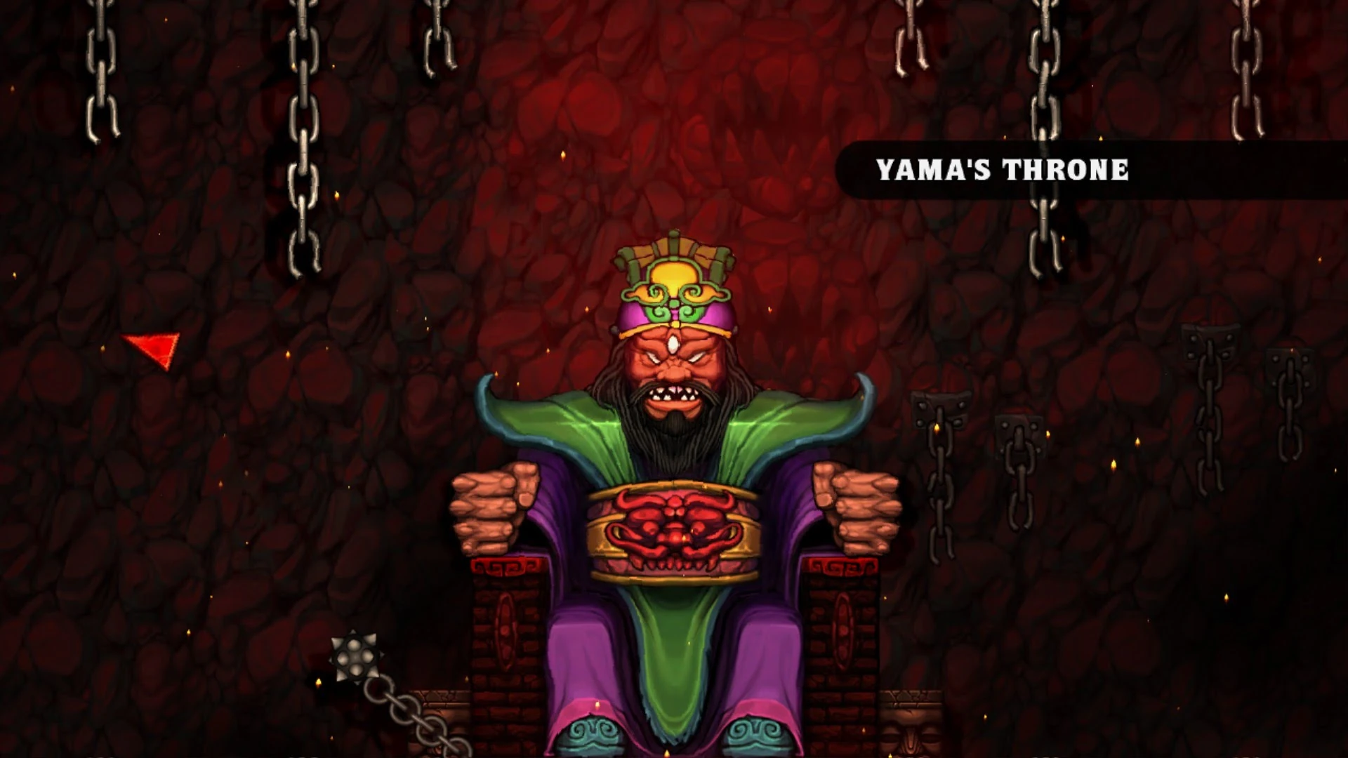 King Yama's Throne consists of a 4x11 mass of ruby blocks (worth $140,800 in total) directly above the entrance that are surrounded by Tiki Traps. At both sides of the throne, chains allow the Spelunker to climb to the top of the room where 3 crates can be found on either the left or right, the exit being on the opposite side.